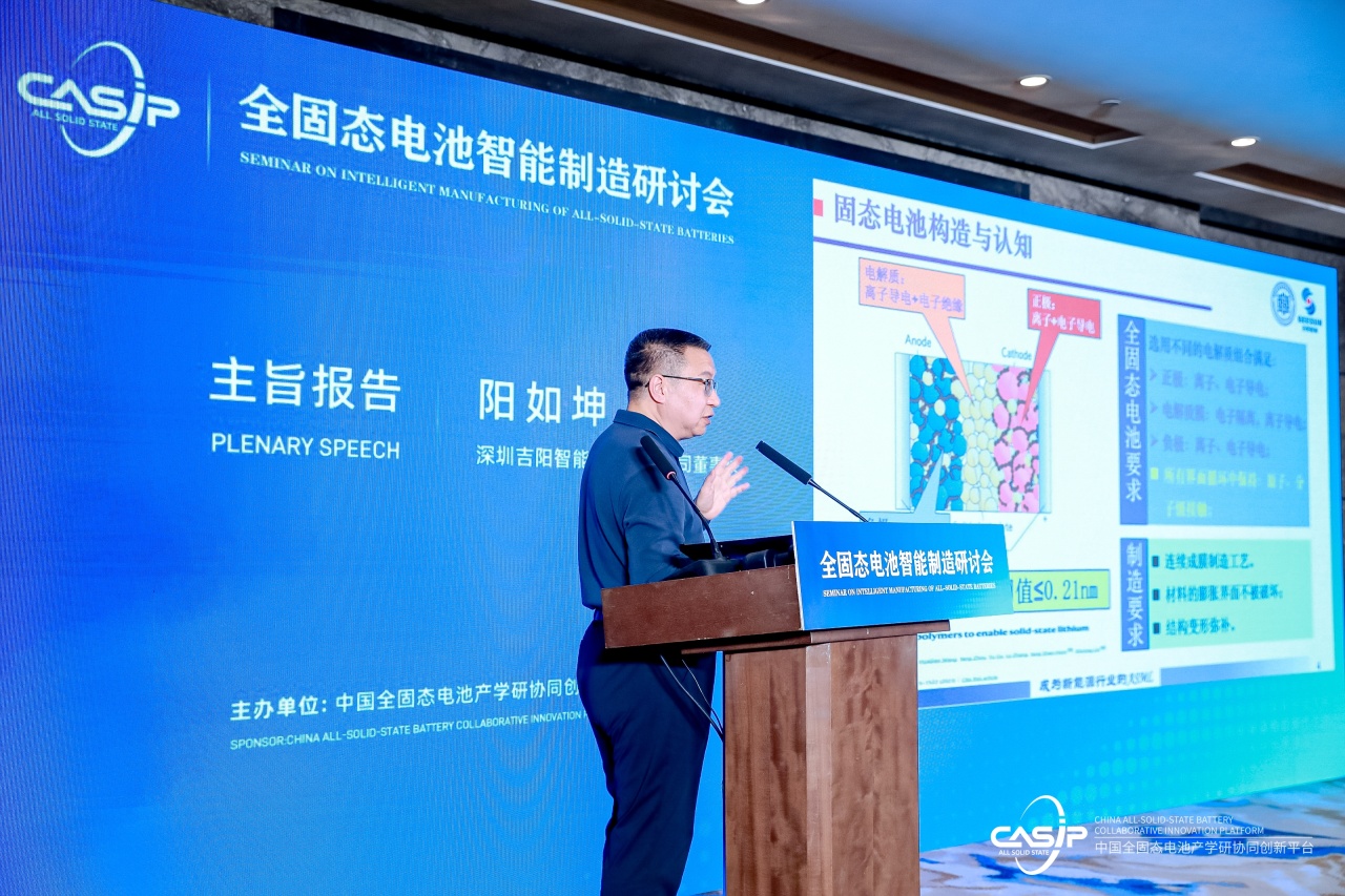 在主旨報告環(huán)節(jié),中國全固態(tài)電池產學研協(xié)同創(chuàng)新平臺專家委員會成員、四川賽科動力科技有限公司董事長朱高龍先生;以及深圳吉陽智能科技有限公司董事長、全固態(tài)電池制造工藝及裝備聯(lián)盟理事長陽如坤先生,分別從不同維度深入剖析了全固態(tài)電池的技術挑戰(zhàn)與未來趨勢。